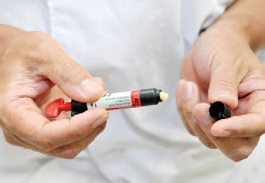 「ちょっと見せてください」小山さんの入れ歯を手に取った先生は、あごに当たるピンク色の部分に白いペーストを塗り、口に戻した。数秒後、取り出してみると盛り上がった土手の一部にペーストが残っていた。「入れ歯があごの骨に合わなくて、キズになっていますね。少し削りましょう。」と小山さんと確認しながら作業を進めていく。調整した入れ歯を試し噛みしてもらうと「まったく痛くありません!!」と笑顔の小山さんは、足取り軽く帰っていった、痛くない入れ歯が、こんなに人を明るくすることを実感しました。「お金をいただいたら、それだけの結果を出します」と越田先生の言葉には偽りはない。次号では、インプラントの治療をご紹介します。